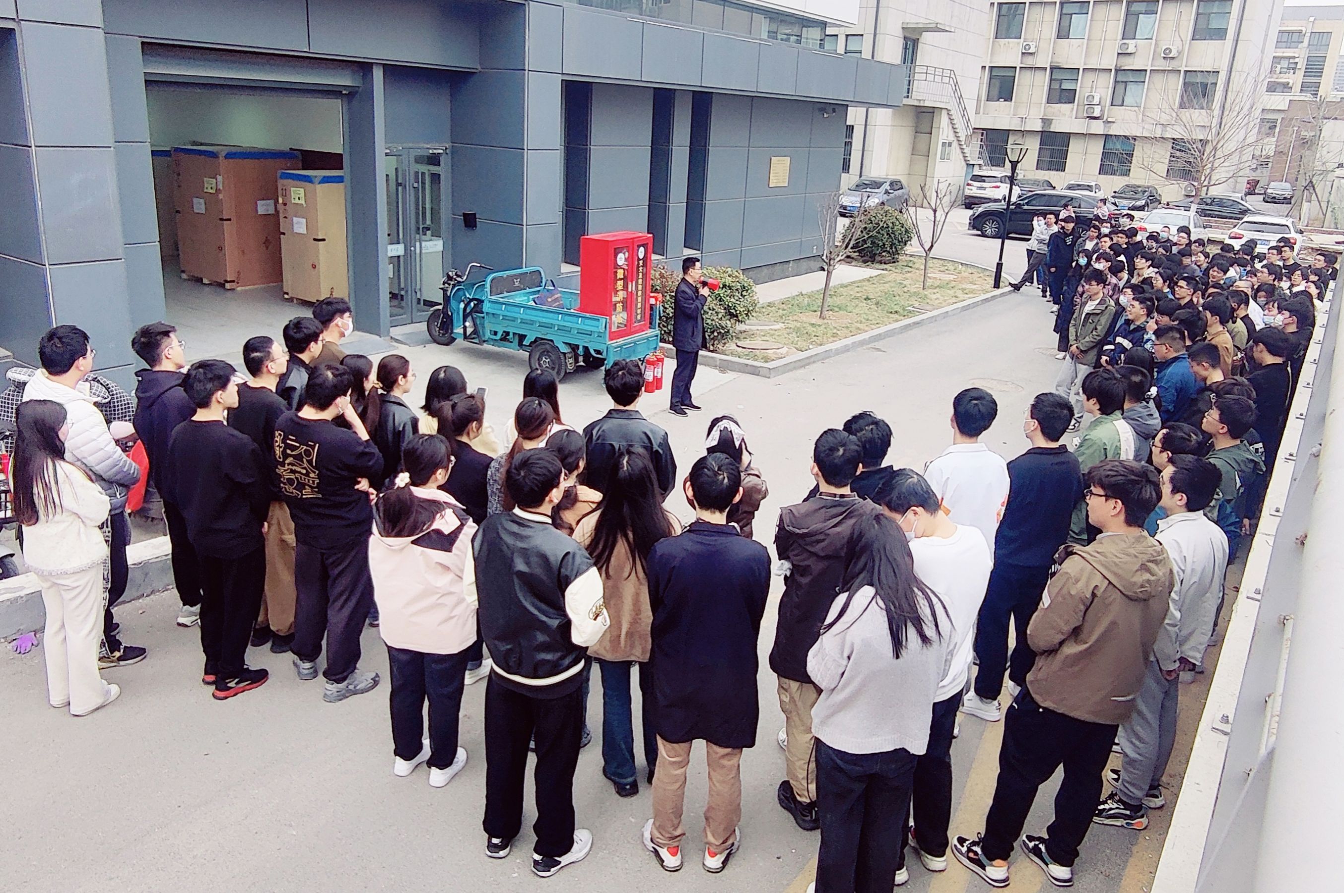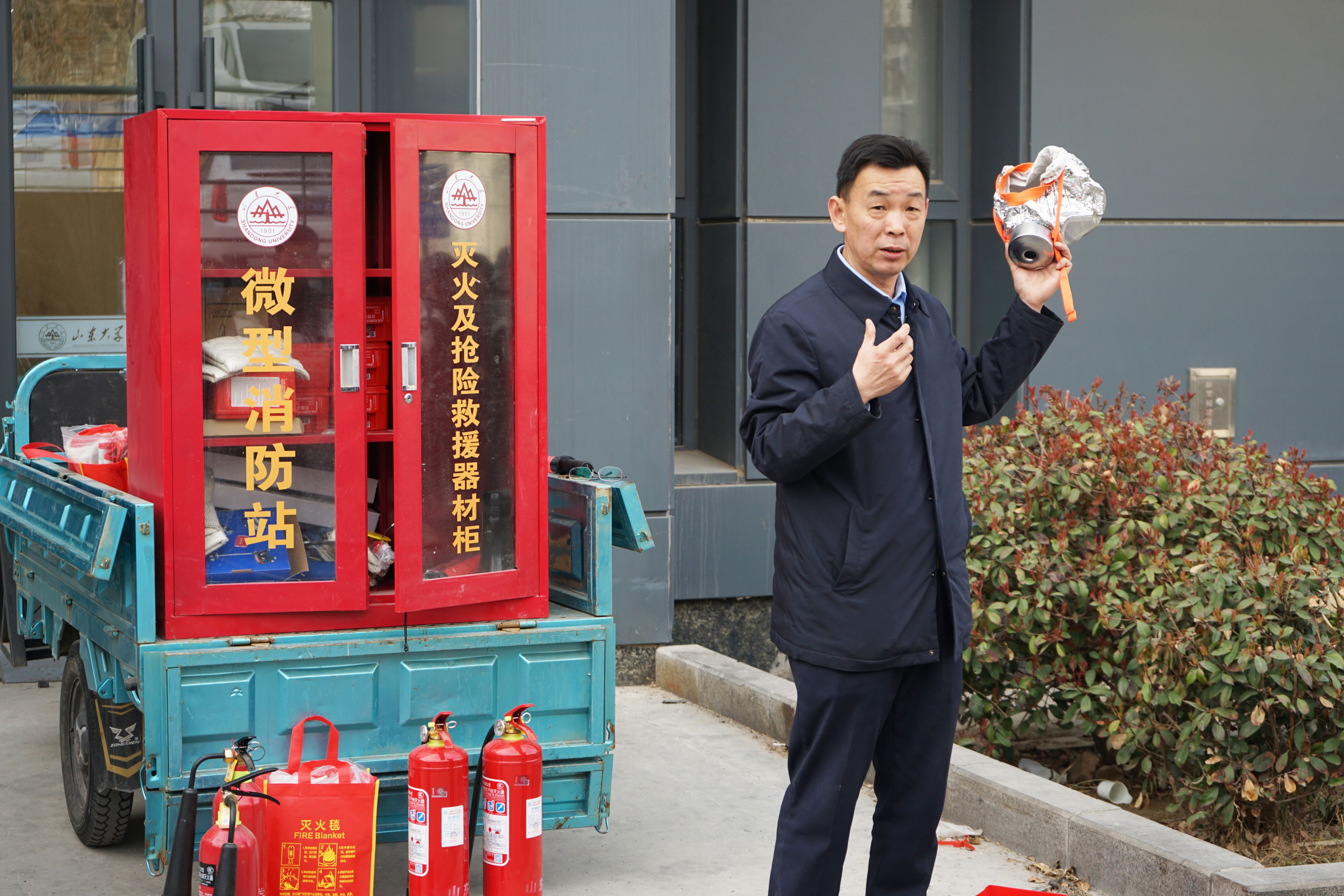 随后,杜春兴科长进行了现场指导,为大家讲解了消防应急柜中的物品清单,重点展示了二氧化碳灭火器、灭火毯、防毒面罩等消防器材的使用方法。他结合近年来全国重大火灾和学校有关案例,详细解读了火灾的形成机制和预防措施,提醒大家要时刻保持警惕,注意防范火灾的发生。
