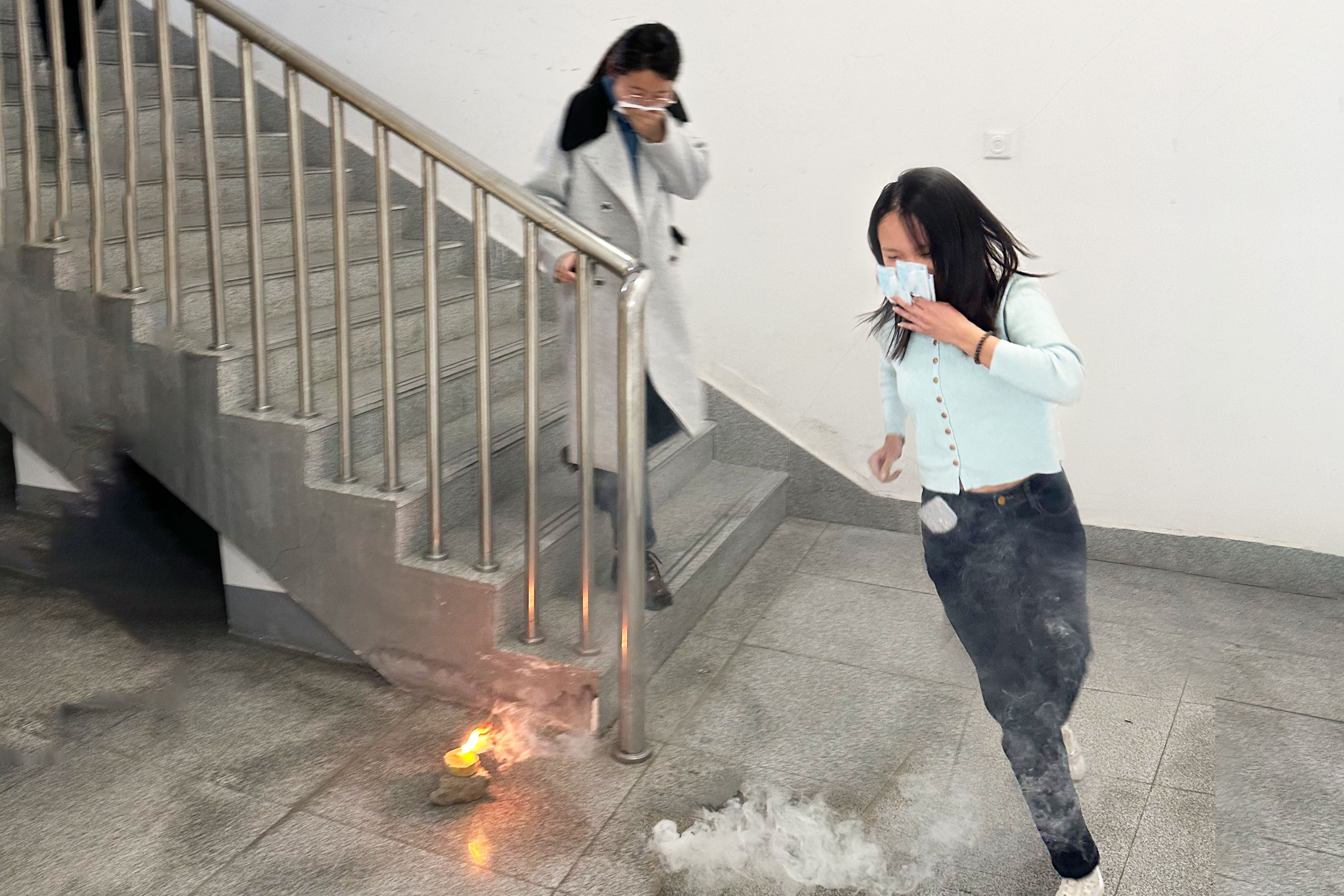 演练当日,大楼内浓烟弥漫,警铃急促,楼内师生用湿毛巾捂住口鼻,本着“安全第一、就近逃生”的疏散原则,在引导员的指引下,沿应急疏散安全路线快速撤离到平台大楼东门外。撤离到安全点后,各年级迅速清点人数,确保无一人遗漏。在全体师生的共同配合下,本次消防疏散演练有序高效,达到预期效果。