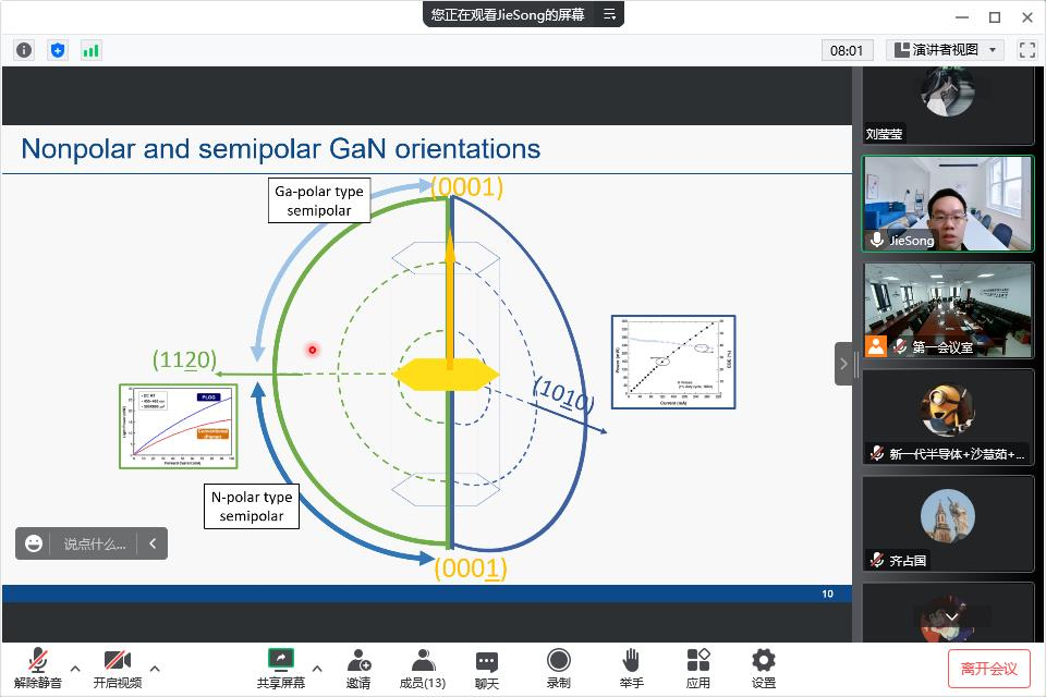 报告结束后,参会师生踊跃发言,围绕图形衬底制备、生长动力学条件以及表面活性剂等对半极性GaN单晶生长影响等方面与宋杰老师进行了深入交流。