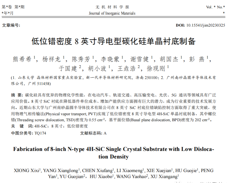 8月,集成攻关大平台碳化硅团队合作以“低位错密度8英寸导电型碳化硅单晶衬底制备(Fabrication of 8-inch N-type 4H-SiC Single Crystal Substrate with Low Dislocation Density)”为题在《无机材料学报》发表(DOI: 10.15541/jim20230325),第一作者熊希希,通信作者陈秀芳、杨祥龙。