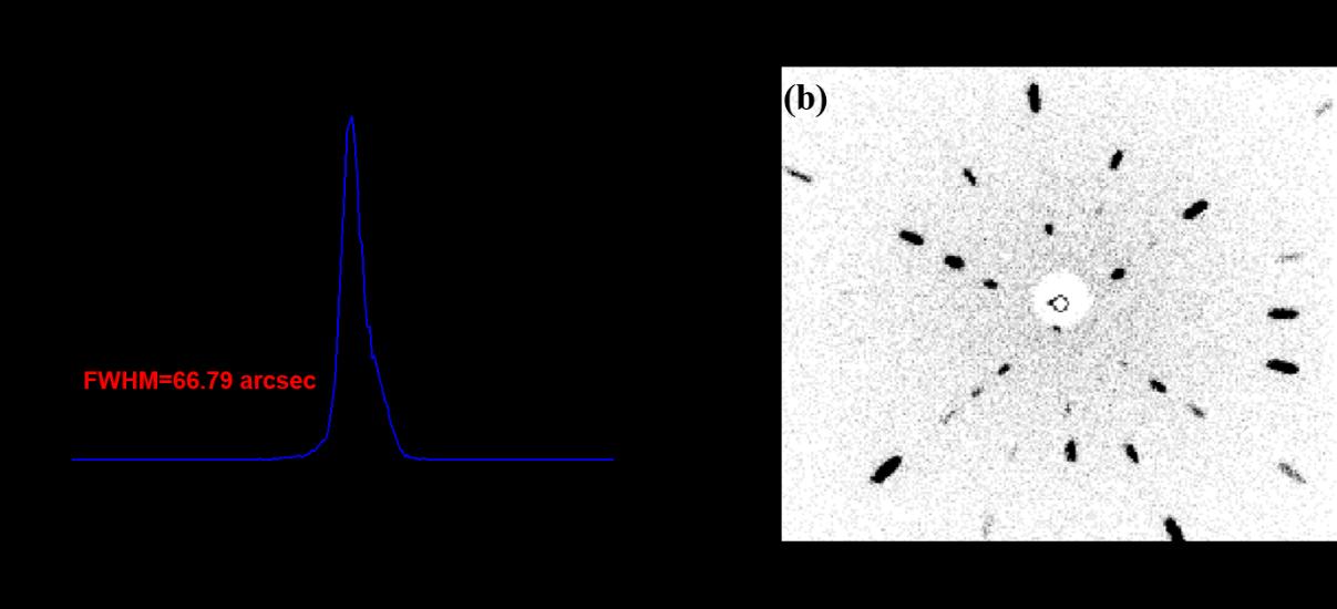 图:β-Ga2O3(011)晶面的(a)摇摆曲线半峰宽及(b)劳厄衍射斑点