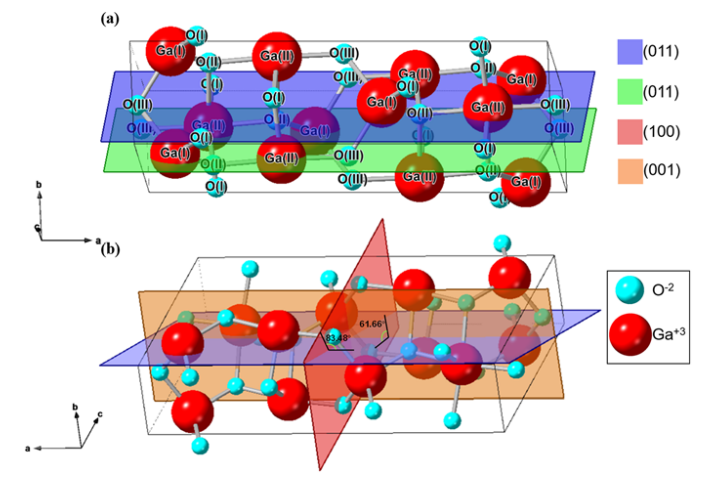 图:β-Ga2O3(a)晶胞及(b)(011)晶面与(100)、(001)晶面的位置关系