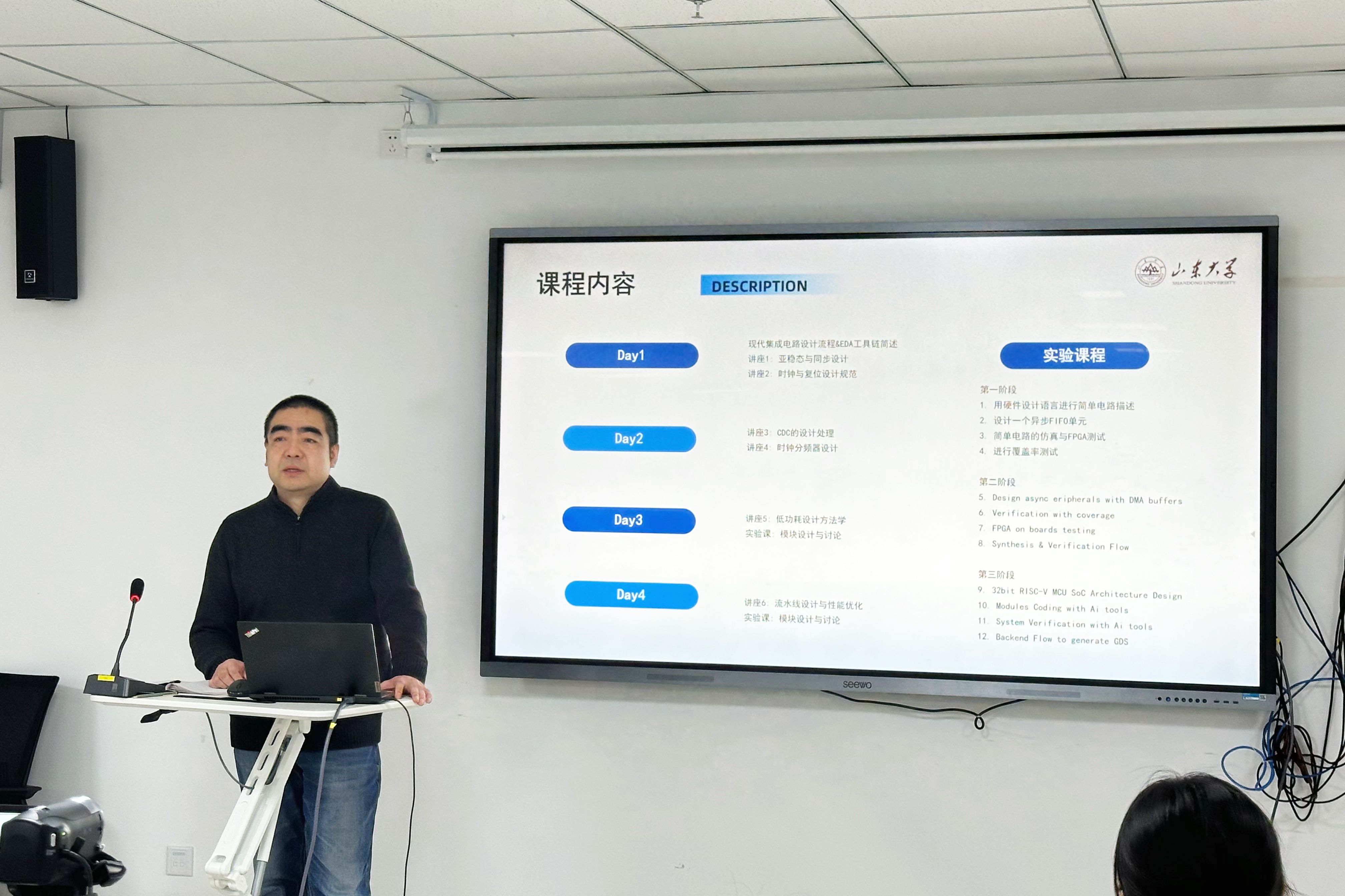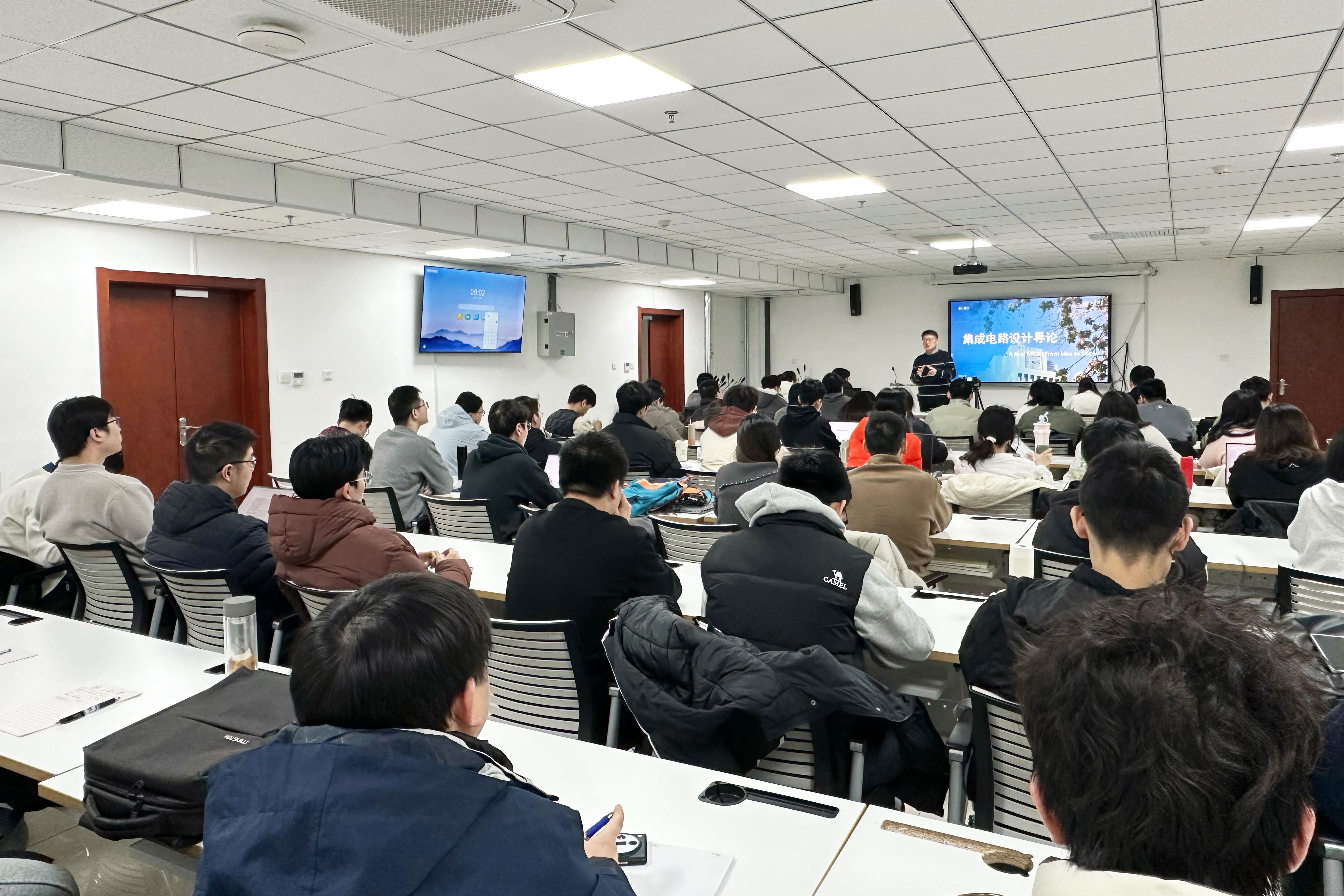 1月27日至30日,专注于SoC架构与低功耗设计领域十余年的王峰博士讲授了《集成电路硬件架构设计导论》。课程聚焦行业前沿,深入剖析了SoC设计全流程、RTL代码规范与验证、多时钟域同步、亚稳态处理等关键技术挑战,系统阐述了低功耗设计方法(如Clock Gating、DVFS)、分频器设计、流水线性能优化及EMC/EMI抑制技术等。通过丰富的实际芯片设计案例解析,课程助力研究生建立起集成电路的设计思维与实践能力。