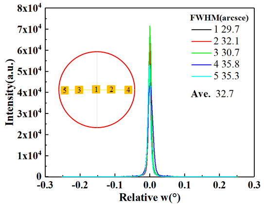图5:8英寸4H-SiC衬底(004)面高分辨XRD摇摆曲线(半峰宽平均值为32.7弧秒)